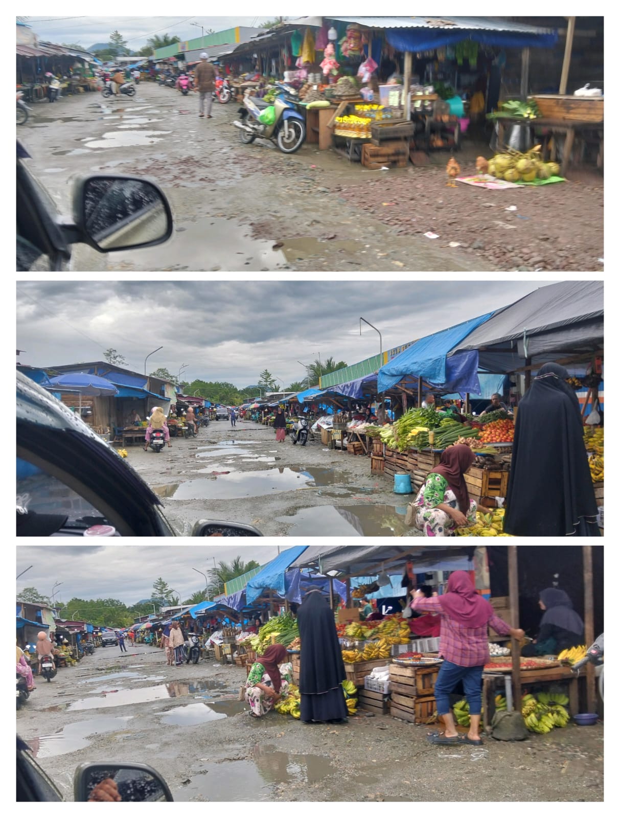 Namun, di balik meningkatnya aktivitas tersebut, kondisi infrastruktur pasar kembali menjadi sorotan. Sejumlah ruas jalan di dalam area pasar dilaporkan dalam keadaan becek dan tergenang air, terutama setelah hujan turun. Permukaan jalan yang tidak rata, disertai lubang yang tertutup genangan, membuat pejalan kaki maupun pengendara roda dua harus ekstra waspada saat melintas.