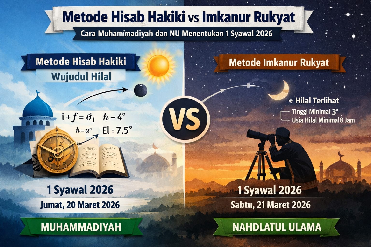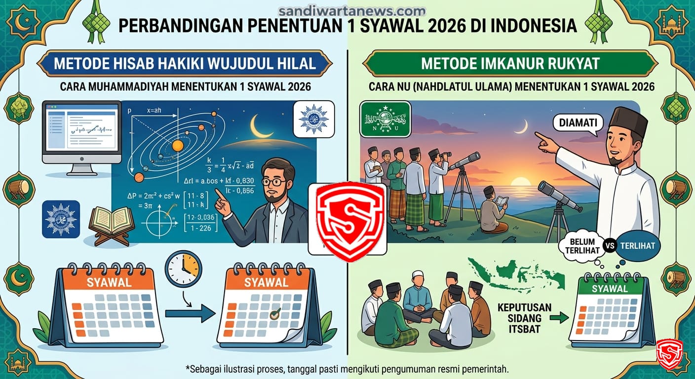 Sandiwartanews.com – Jakarta – Perayaan Idulfitri 1447 Hijriah di Indonesia kembali diwarnai perbedaan penetapan awal Syawal antara dua organisasi Islam besar. Muhammadiyah menetapkan 1 Syawal 1447 H jatuh pada Jumat, 20 Maret 2026. Sementara Nahdlatul Ulama menetapkan hari raya pada Sabtu, 21 Maret 2026. Perbedaan ini berlangsung dalam koridor metodologi yang telah lama dikenal di tengah umat Islam Indonesia.