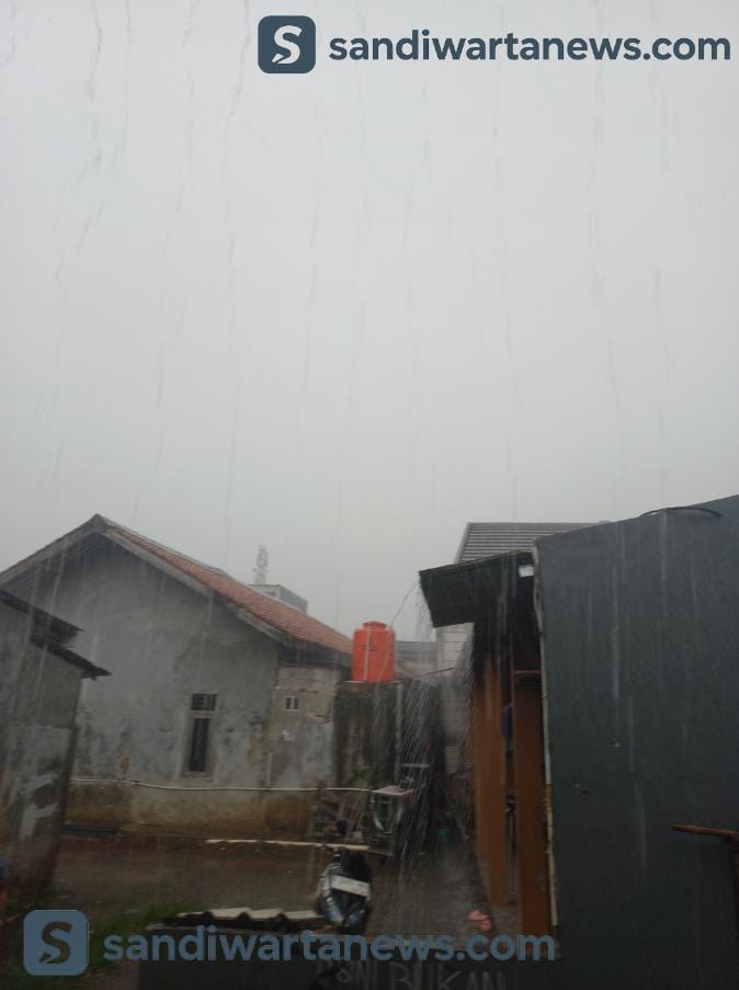 Pantauan sandiwartanews.com, curah hujan yang turun sejak pukul 12.00 WIB berlangsung cukup intens. Sesekali suara gelegar petir terdengar memecah langit mendung, menambah kepanikan warga yang tengah beraktivitas di luar rumah.