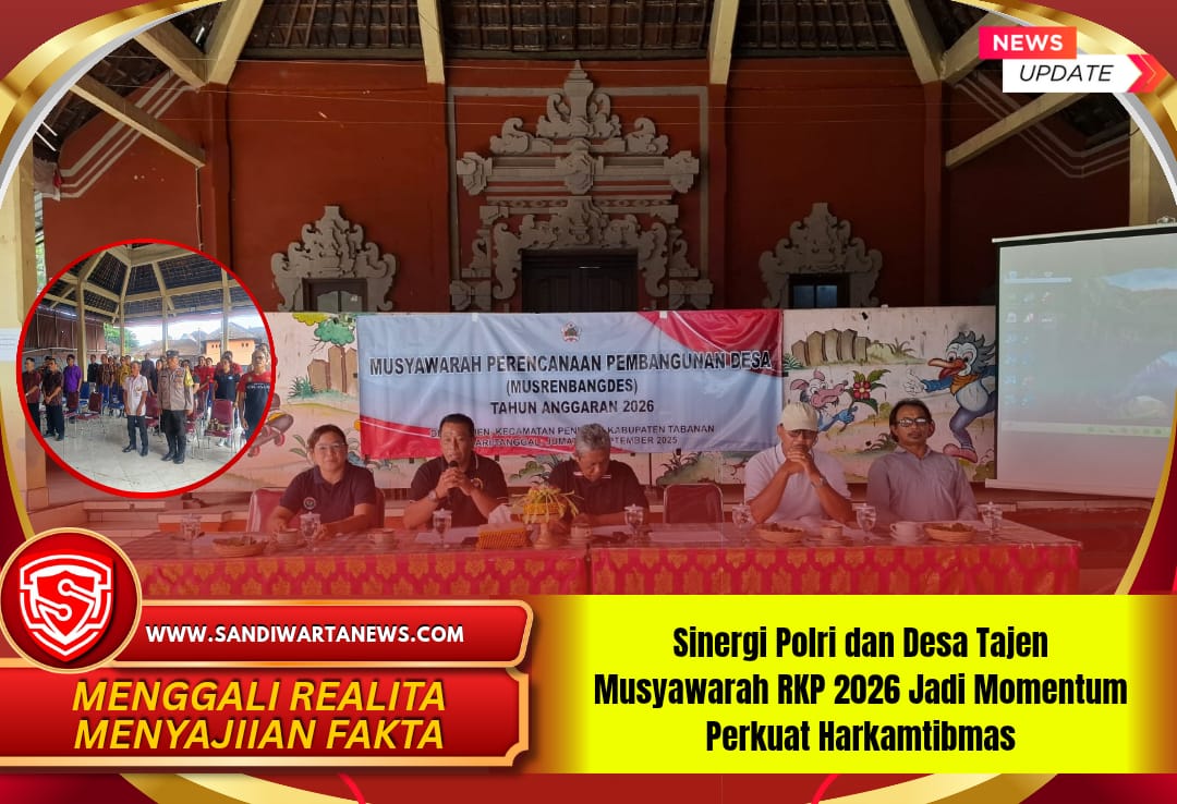 Tabanan sandiwartanews.com – Suasana Musyawarah Perencanaan Pembangunan Desa (Musrenbangdes) Tajen Tahun Anggaran 2026 yang digelar Sabtu (26/9/2025) pagi berlangsung penuh semangat. Kegiatan yang dimulai pukul 08.30 WITA itu dihadiri jajaran pemerintah desa, perwakilan kecamatan, serta Bhabinkamtibmas Desa Tajen Aiptu I Made Masna, sebagai bentuk dukungan kepolisian terhadap pembangunan desa dan keamanan masyarakat.