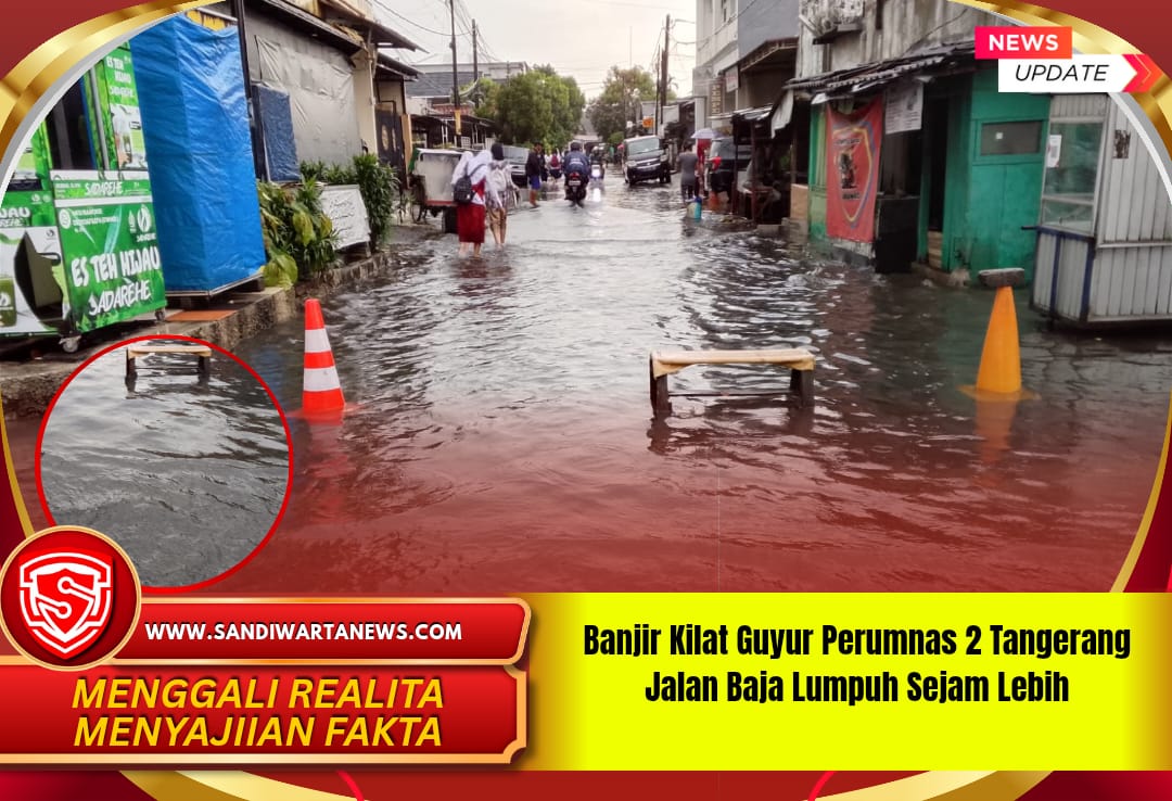 Tangerang – sandiwartanews.com – Hujan deras yang turun singkat pada Senin siang mendadak memicu banjir kilat di kawasan Perumnas 2 Tangerang, Banten. Genangan air yang mencapai setengah ban roda motor membuat sejumlah ruas jalan di sekitar Jalan Baja dan Borobudur Raya lumpuh seketika (29/9/2025).