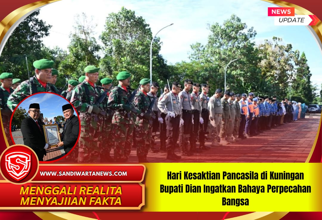 Kuningan – sandiwartanews.com – Suasana khidmat menyelimuti lapangan Pemerintah Kabupaten Kuningan, Kompleks Islamic Centre Winduherang-Cigugur, Rabu (1/10/2025). peserta dari unsur TNI, Polri, ASN, pelajar, hingga organisasi kemasyarakatan mengikuti upacara peringatan Hari Kesaktian Pancasila yang dipimpin langsung oleh Bupati Kuningan, Dr. H. Dian Rachmat Yanuar, M.Si.