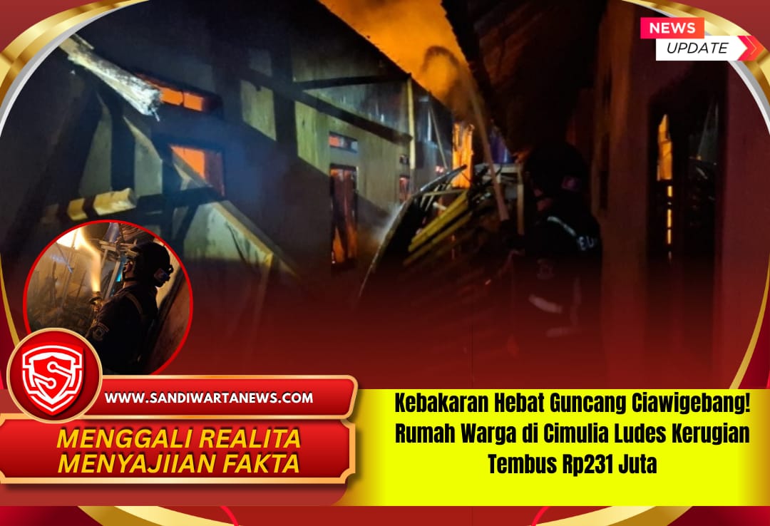 KUNINGAN – Sandiwartanews.com – Warga Dusun Cimulia, Desa Karangkamulyan, Kecamatan Ciawigebang, Kabupaten Kuningan, digegerkan oleh kebakaran besar yang melanda sebuah rumah warga pada Minggu dini hari (12/10/2025). Meski tidak ada korban jiwa, kerugian material diperkirakan mencapai lebih dari Rp231 juta.